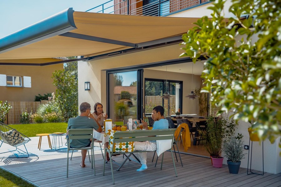 Det er ikke længere mere manuel betjening! Vælg komfort med Somfys automatisering. Styr ikke kun din elektriske markise, men også belysningen og opvarmningen på din terrasse via din smartphone eller med en Somfy fjernbetjening.