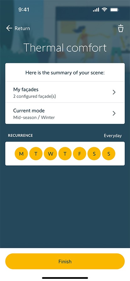 Med det forudkonfigurerede “nat”-scenarie hjælper TaHoma dig med at reducere elforbruget uden besvær. Den slukker ubrugte enheder og lys, sænker varmen og lukker rullegardinerne – så du sparer energi uden at tænke over det.