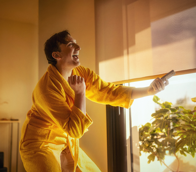 Med TaHoma er dit privatliv altid beskyttet. Efter en lang dag kan du slappe af derhjemme ved at sænke dine gardiner eller rullegardiner, dæmpe lyset og afspille din yndlingsmusik – alt sammen nemt med ét tryk i appen eller med din stemme. TaHoma forvandler dit hjem til det perfekte private fristed.