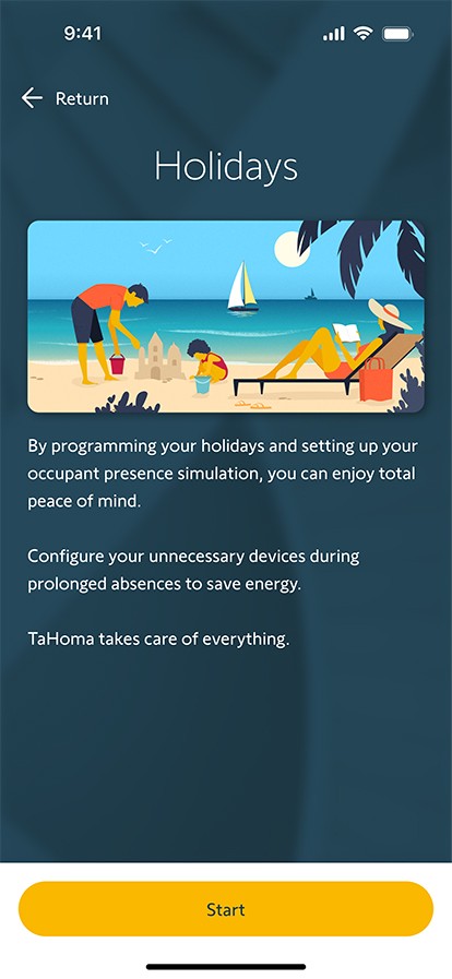 Slap af på din ferie med fuld ro i sindet. I TaHoma-appen kan du programmere dine rullegardiner, gardiner eller lys til at fungere på faste tidspunkter eller med tilfældige intervaller, så det ser ud som om, nogen er hjemme. For endnu større sikkerhed kan du udvide dit system med en Somfy-kompatibel alarm.