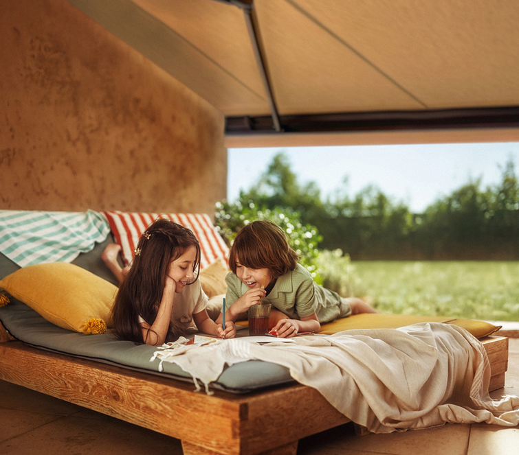 Med Somfys forbundne løsninger får du mest muligt ud af dine udendørsområder – helt ubesværet. Din markise tilpasser sig vejret, beskytter dine børn mod solen og kører ind under stormvejr. Til sommeraftener kan du oprette scenarier i TaHoma-appen til at styre din pergola, belysning og musik – for perfekte middage med venner.