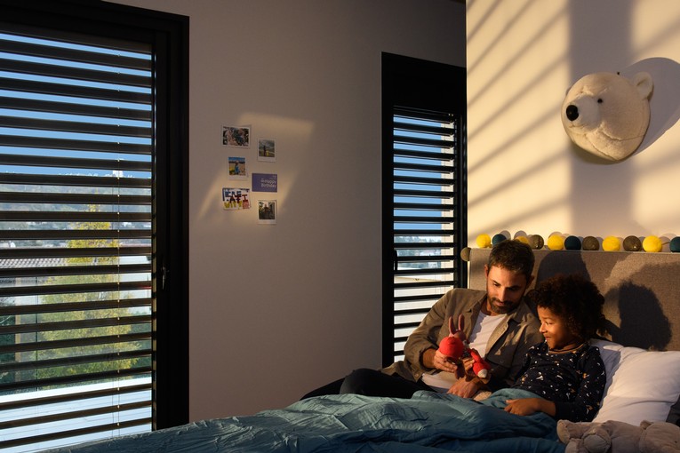 Men det er ikke noget problem, for i løbet af dagen justerer dine opkoblede, udvendige persienner automatisk lamellerne til en præcis vinkel, hvor tilpas meget lys kommer ind uden at blænde.